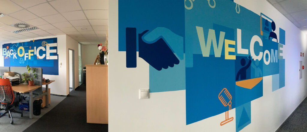 Inspiráló, színekben és formákban gazdag kellemes légkör kialakítása a kollégák és ügyfelek számára. Az irodai dekorációs festés nem csak a branding kiváló eszköze, de bizonyítottan javítja a munkahelyi légkört és hangulatot is. Így hát nem meglepő, hogy Az év irodája díj nyertesei között szinte mindegyik esetben megtalálható dekorációs falfestés.
